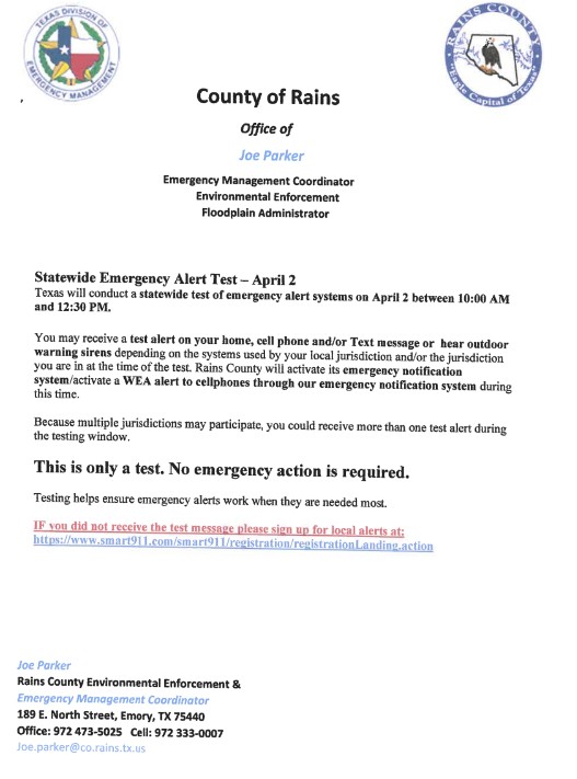 On Thursday, April 2, 2026, at the request of Texas Division of Emergency Management (TDEM), a statewide test of emergency alerting systems will occur between 10:00 AM and 12:30 PM. As part of this drill, local jurisdictions across Texas may test systems used to notify the public during emergencies. Depending on the jurisdiction you are in at the time of test, you may receive a test alert on your mobile phone and/or hear outdoor warning sirens. Rains County will activate its emergency notification system/activate a WEA alert to cellphones through our emergency notification system during this time.